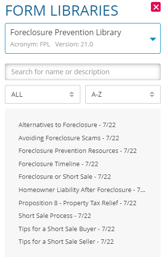Accessing C.A.R.'s Foreclosure Prevention Library is fast and easy. C.A.R.'s Foreclosure Prevention Library is available in your Lone Wolf Transaction (zipForm Edition) library forms drop-down menu. For more information, e-mail C.A.R. Customer Service at [email protected].